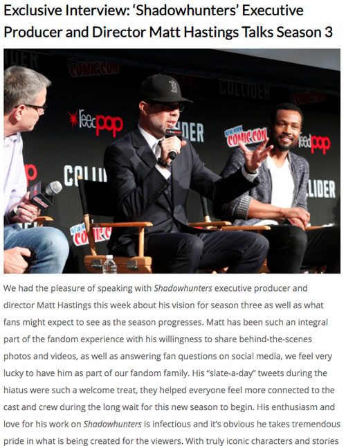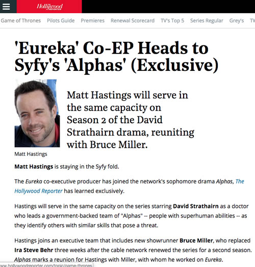 Matt was brought on to reboot and re-imagine SHADOWHUNTERS from the ground up for FreeForm and Netflix. This directly followed a 3 year run on THE ORIGINALS (66 episodes) for the CW as well as 4 seasons of EURKEA and Season 2 of ALPHAS (starring Academy Award Nominee David Strathairn and Mahershala Ali) for SYFY.