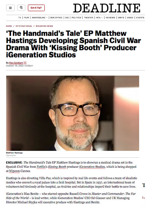 Matt has a number of pilots in development with companies such as Netflix, SONY, eOne-Lionsgate, MediaPro, Federation, Beta, AGC, Notorious Pictures, Blink49, among others. On the feature-film front, he is attached to direct HUSH HUSH for Paramount as well as EVENSONG for Voltage and Eden Rock Media which is slated for a 2024 production start.